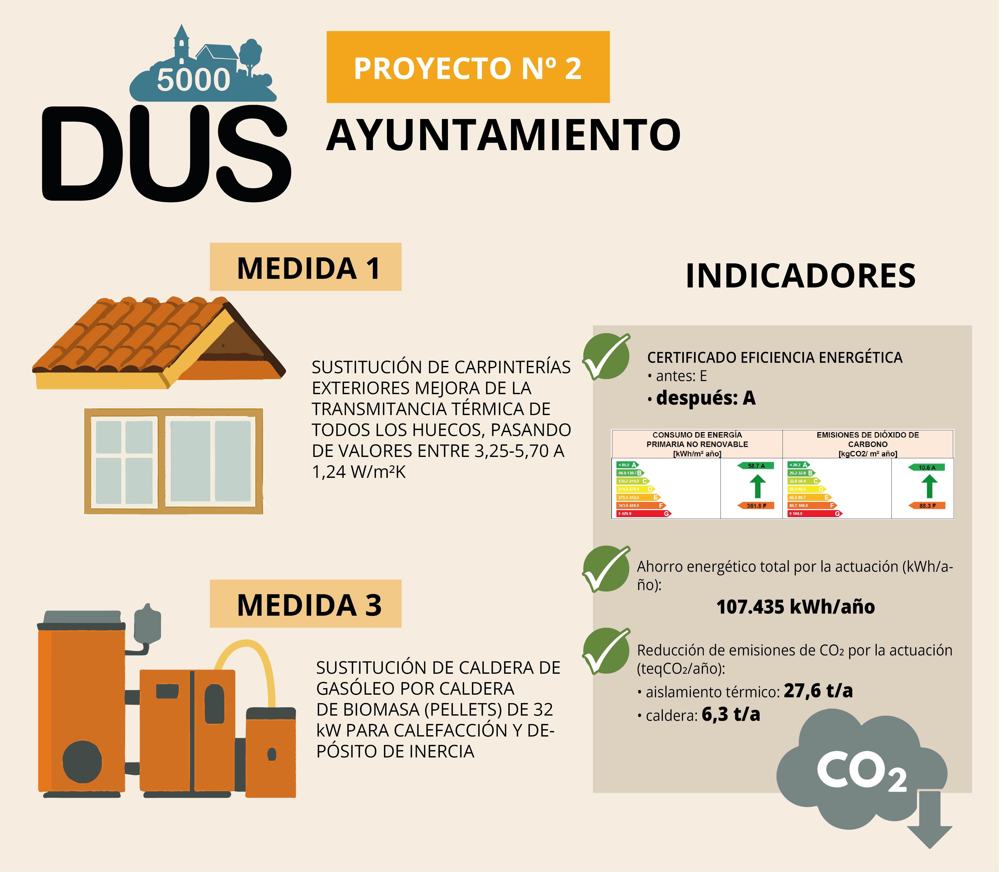 Medida 3: sustitución de la caldera de gasóleo existente que proporciona la energía térmica necesaria para calefactar y para la producción de ACS en el edificio del Ayuntamiento por una nueva caldera de biomasa de pellets de 32 kW de potencia. Además, se llevarán a cabo la siguientes actuaciones: adaptación de la sala de máquinas, instalación depósito de inercia, instalación de un silo para el combustible y reforma de la instalación hidráulica y eléctrica existente.