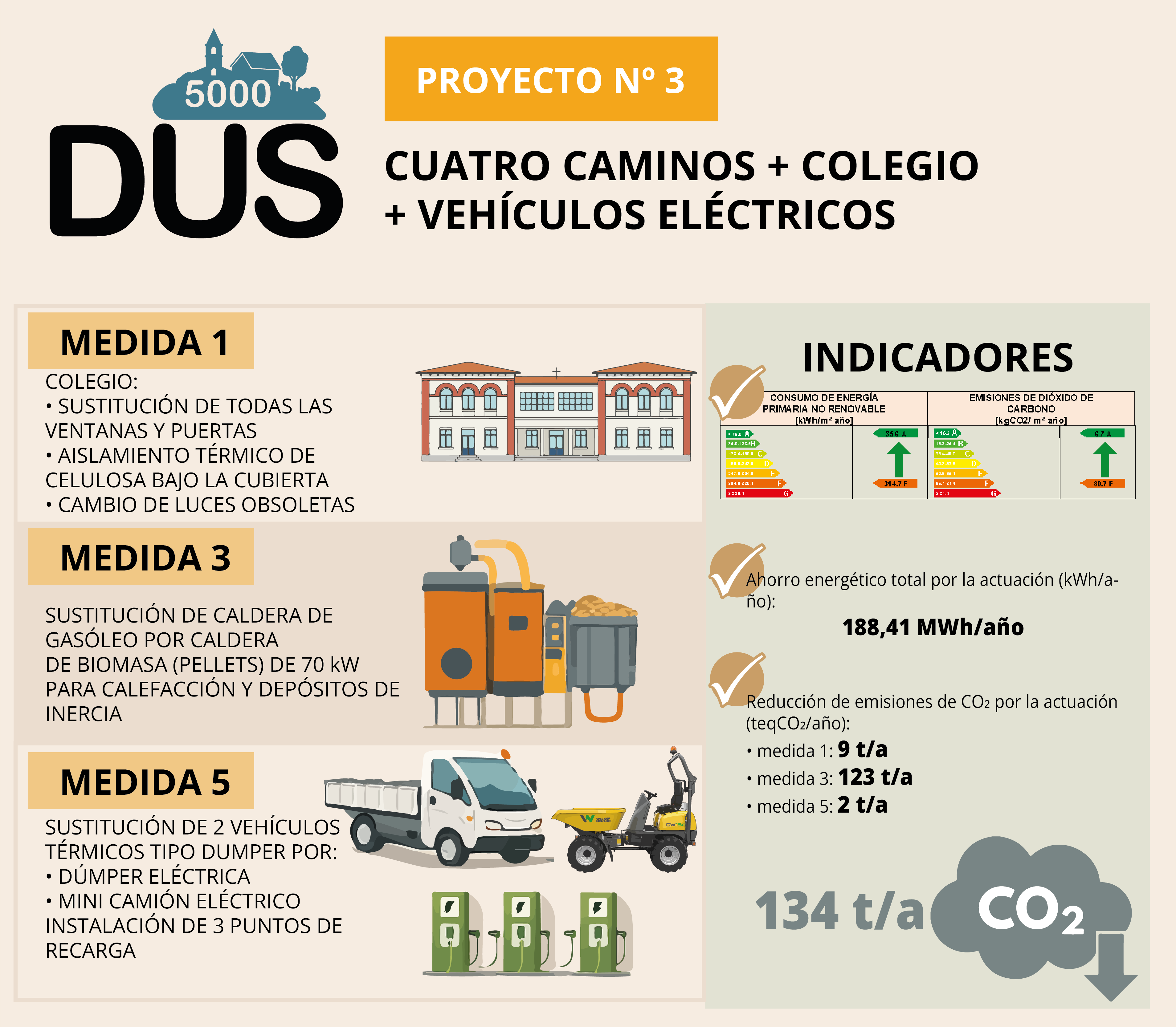 Medida 3: sustitución de los equipos generadores existentes que proporcionan la energía térmica necesaria para calefactar y producir ACS en los edificios Colegio El Barranco y Cuatro Caminos por una nueva caldera de biomasa de 70 kW de potencia, que proporcionará calefacción y ACS a los anteriores edificios mediante una red de calor. Actuaciones: Adaptación/Construcción de la sala de caldera; Instalación de depósitos de inercia; Instalación de un silo para el combustible; Reforma de la instalación hidráulica y eléctrica existente; Instalación de un sistema de control y regulación telegestionado; Obra civil para red de calor. Con las actuaciones de medida 1 y medida 3: En el Colegio El Barranco las emisiones se reducirán de 81,4 kgCO₂/m² año a 6,8 kgCO₂/m² año y la calificación energética del edificio pasará de F a A. En Cuatro Caminos las emisiones se reducirán de 123,2 kgCO₂/m² año a 8,2 kgCO₂/m² año y la calificación energética del edificio pasará de G a A.