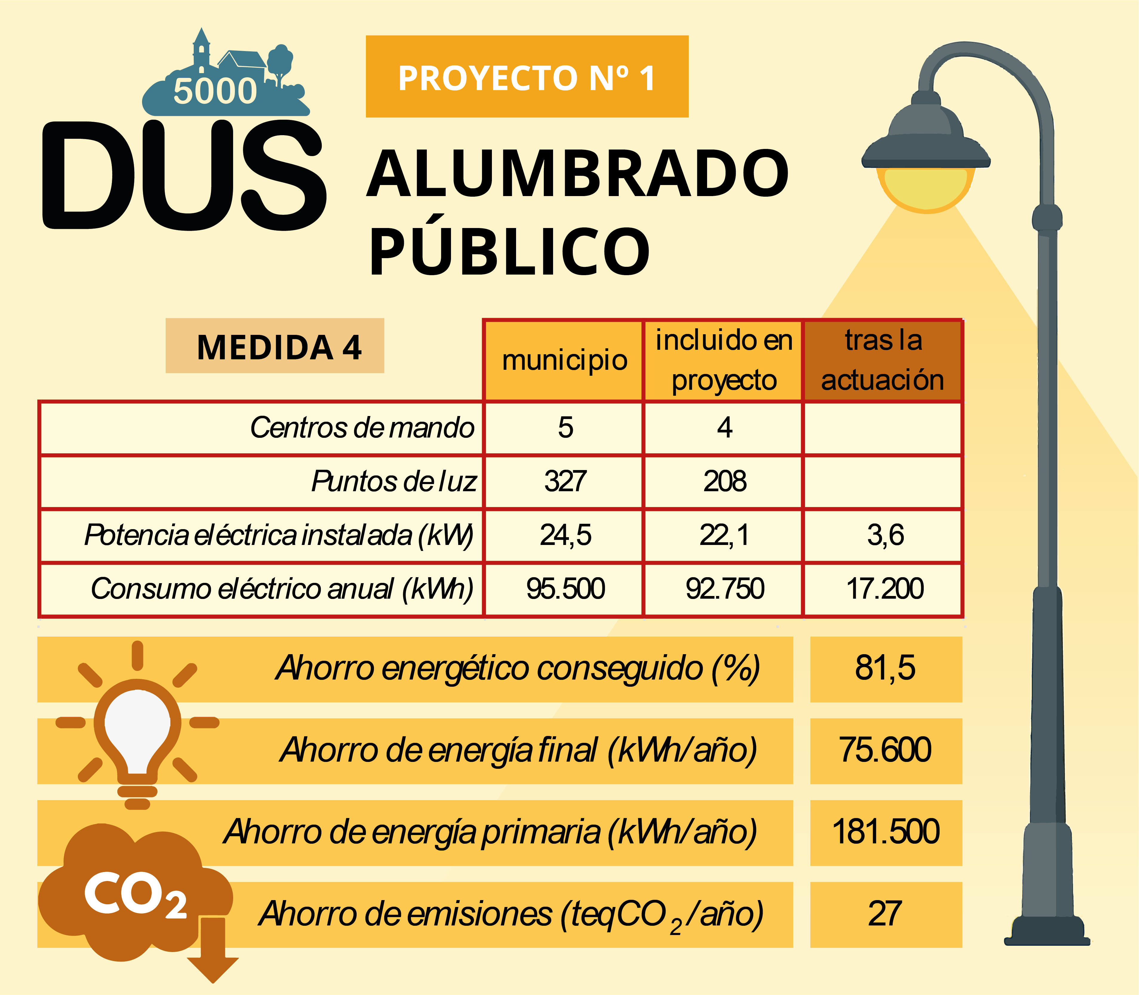 Consiste en la renovación de las instalaciones de alumbrado exterior. Se va a actuar en 321 puntos de luz de los 327 existentes en el municipio, sustituyendo 208 luminarias por nuevas de tecnología LED. Respecto a los cuadros de mando, el proyecto contempla actuaciones en 4 de los 5 existentes en el municipio, los cuales van a ser reformados para adaptarlos a la normativa vigente. Además, se instalará un sistema de telegestión centralizada que permita obtener y gestionar información detallada sobre consumos, mantenimiento y flujos luminosos. Con esta actuación se disminuirá la potencia de 26,30 kW a 12,01 kW, y se conseguirá un ahorro energético estimado del 68%.