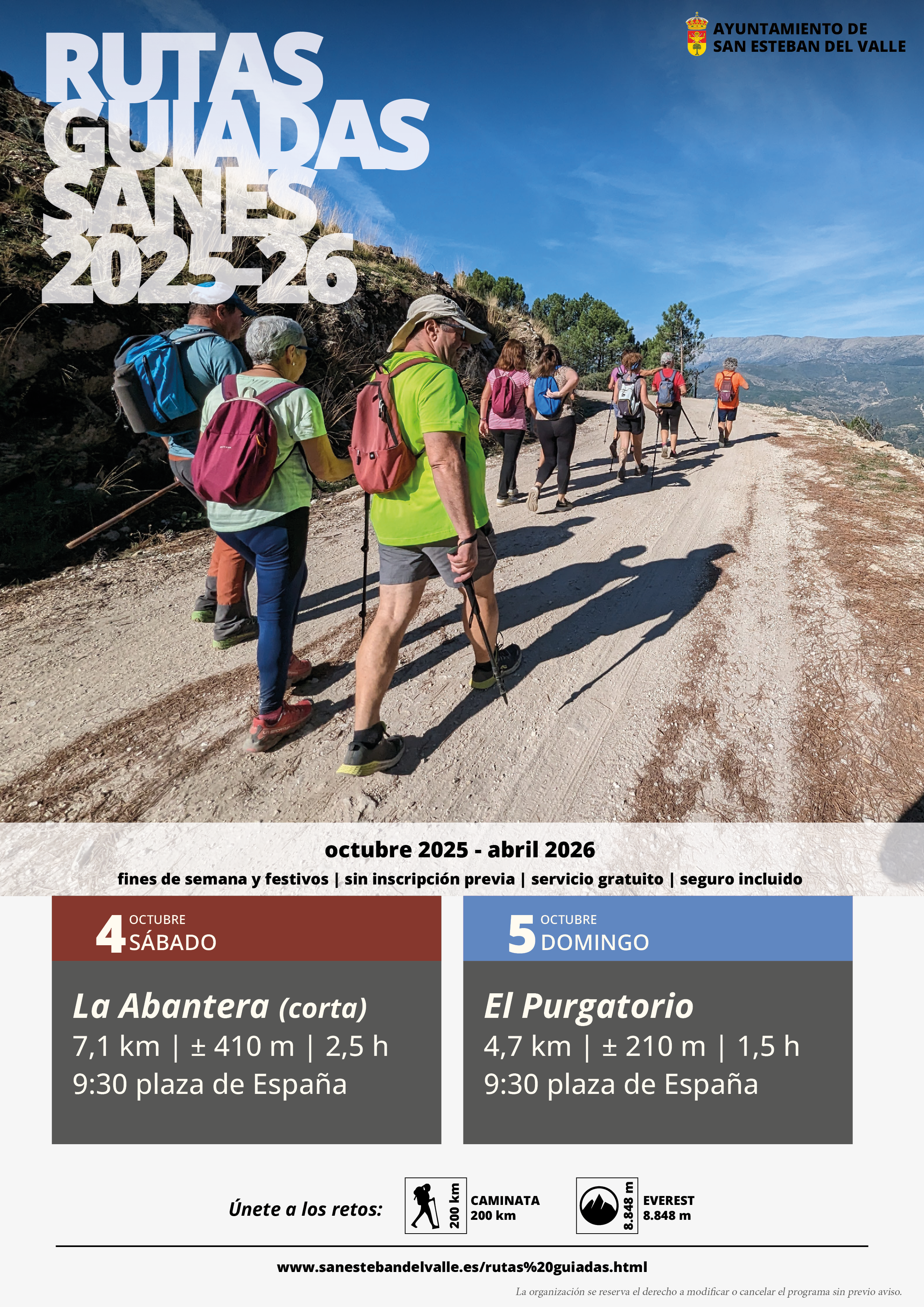 Ir a Perfil del contratante. Ir a DUS5000. 6ª temporada de rutas guiadas y nuevas visitas culturales en San Esteban del VallePublicado el: 3/10/2024 Comienza la 6ª temporada de las rutas guiadas, de octubre a marzo. Desde 2019, este programa ha invitado a los vecinos y visitantes a descubrir el entorno natural del municipio, siempre de la mano de nuestros guías de senderismo. Este año, el recorrido se amplía con nuevas rutas que salen del municipio, así como temáticas como la micológica, la del aceite o la de las cuevas, haciendo de cada caminata una experiencia única. Con el objetivo de mantener el entusiasmo, el Ayuntamiento vuelve a lanzar los populares retos para motivar a los participantes a recorrer el mayor número de kilómetros y ascender más altitud. Los dos desafíos, “Caminata” y “Everest”, premiarán a los tres senderistas que hayan recorrido más distancia y acumulado mayor desnivel al final de la temporada. El calendario semanal de rutas incluirá la información detallada de las salidas, y se publicarán los progresos de cada senderista en esta web. Este primer fin de semana de octubre ya se han programado las primeras salidas: