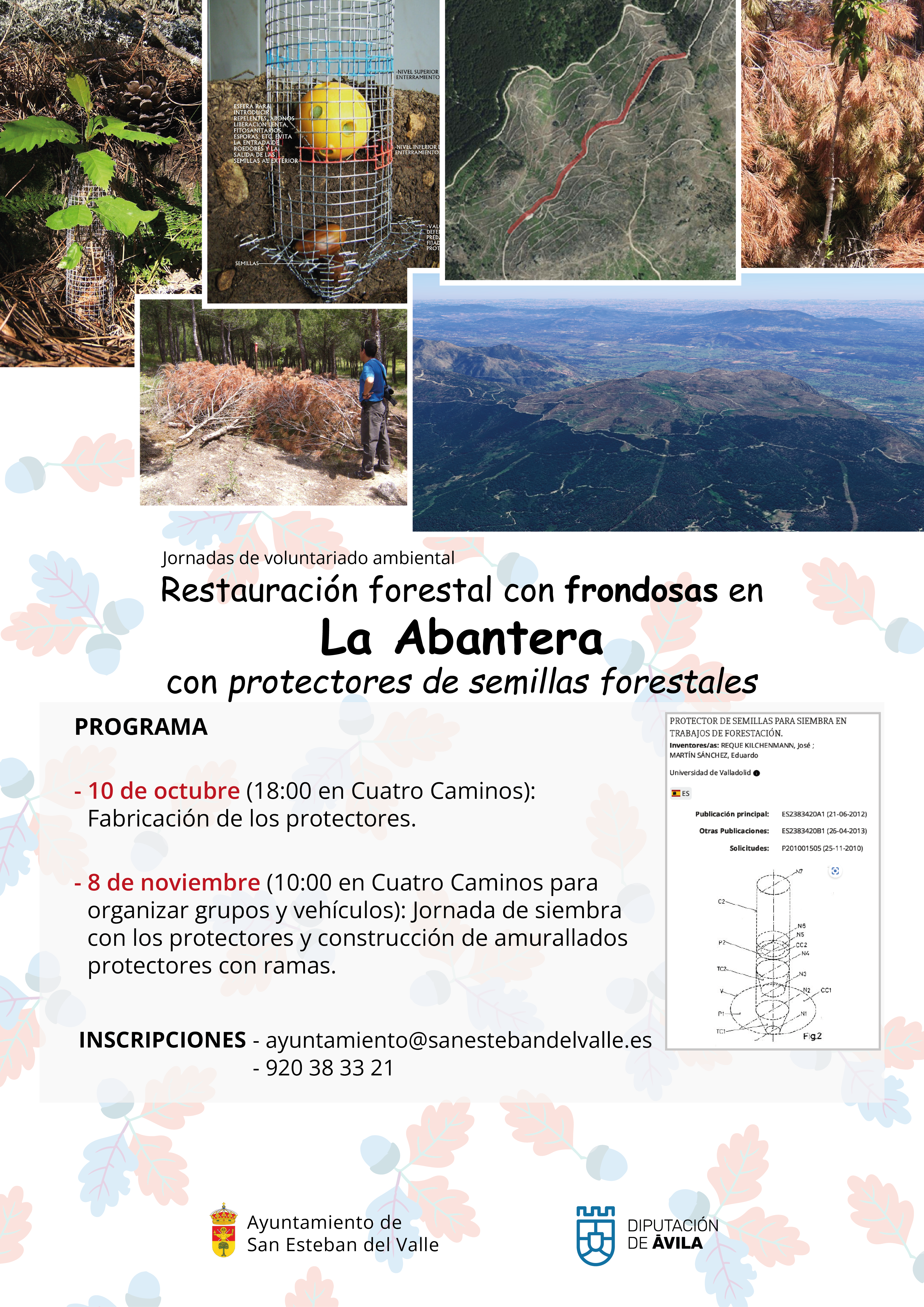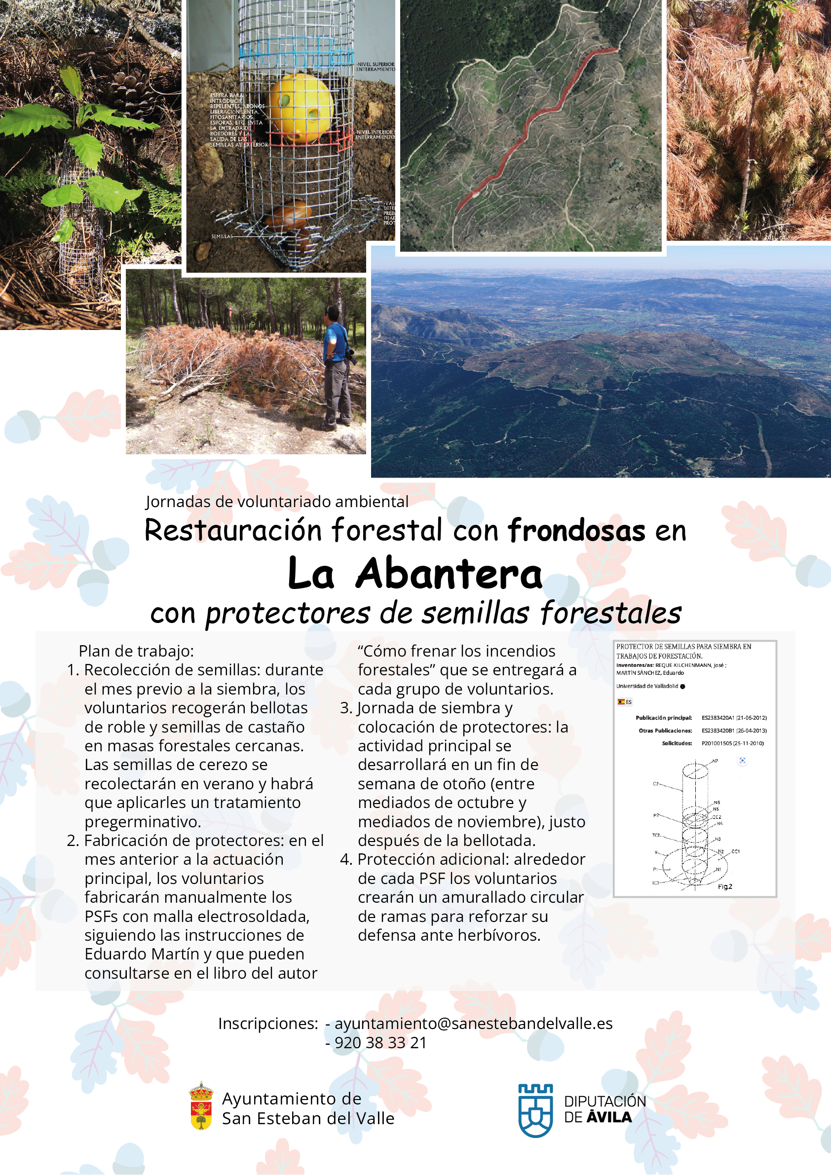 🚫 No se admiten: residuos de origen no domiciliario, voluminosos de +1000 litros con restos peligrosos, materiales no identificables, residuos clínicos o infecciosos, radioactivos, neumáticos ni basura doméstica/ orgánica. Quién puede usar el servicioCualquier vecino de los 11 municipios de la Mancomunidad, empadronado, con residencia o propiedad en el Bajo Tiétar, podrá llevar residuos a cualquiera de los Puntos Limpios. Desde la Mancomunidad se destaca que con esta gestión se ofrecerá un servicio más amplio, eficiente y con mayores horarios de apertura, incluyendo la recogida de escombros de pequeñas obras y restos de poda. ![]() Restauración forestal con frondosas en La AbanteraPublicado el: 10/09/2025 El Ayuntamiento de San Esteban del Valle, con la colaboración de la Diputación de Ávila, organiza unas jornadas de voluntariado ambiental para restaurar la zona de La Abantera mediante la siembra de frondosas (robles, castaños y cerezos) y la colocación de protectores de semillas forestales. Plan de trabajo de los voluntarios: